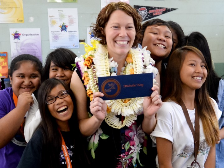 Kalakaua Middle School | Honolulu, HI | Mar 03, 2014Michelle poses with her Milken Educator Awards envelope and the proud future scientists she inspires every day.