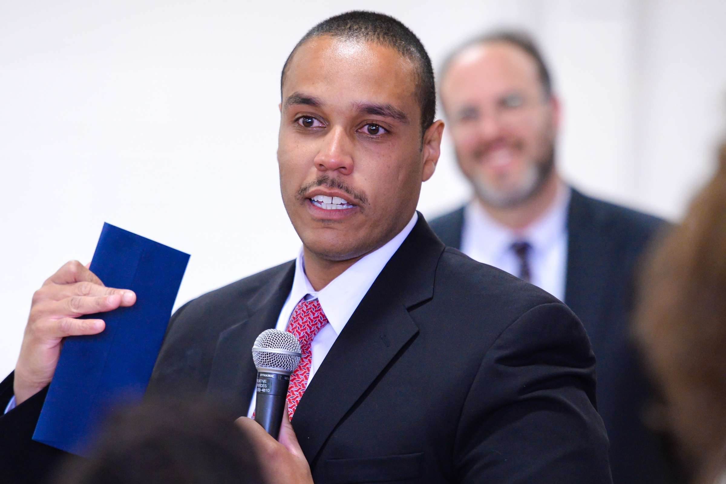Metacomet Elementary School | Bloomfield, CT | October 9, 2014Desi takes the microphone to thank everyone who has made this moment possible, starting with his mentor, Leon McKinley, and ending with the students that make it all worthwhile.