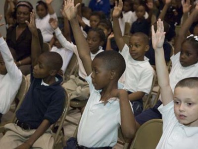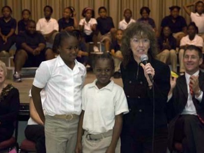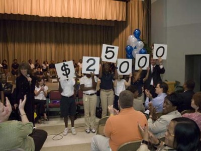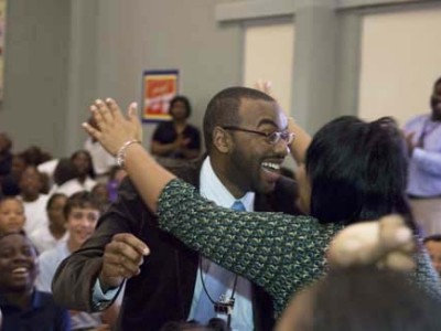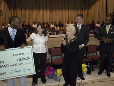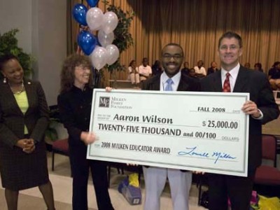 Hattiesburg, Mississippi | Oct 09, 2008New Milken Educator Aaron Wilson is congratulated by veteran Mississippi Milken Educators Amy Rogers (MS '04) and her mother-in-law, Jacqueline Rogers (MS '92).
