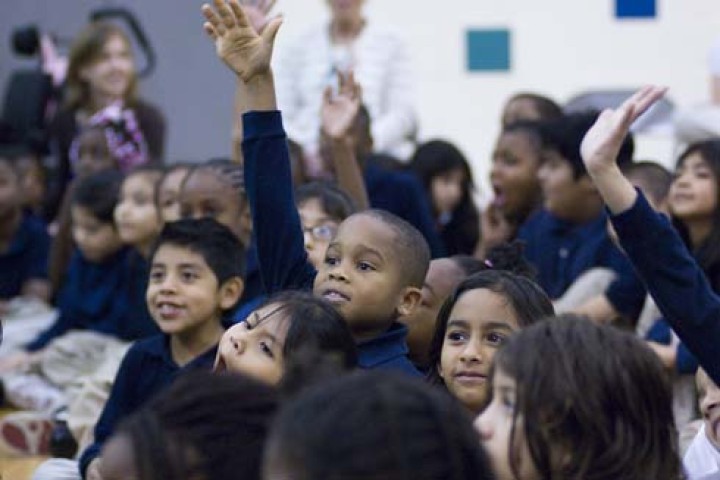 Minneapolis, Minnesota | Oct 14, 2008Nellie Stone Johnson Community School's motivated students raise their arms, hoping to participate in Lowell Milken's special announcement.