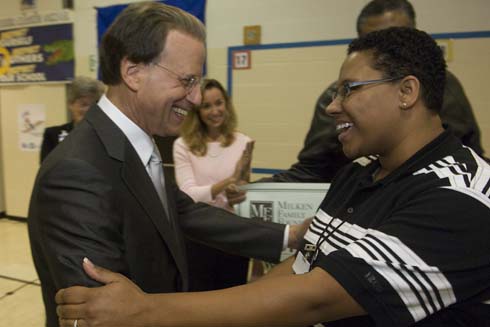 St. Paul, Minnesota | Oct 14, 2008Foundation Chairman Lowell Milken congratulates Tracey Cross after surprising her with a $25,000 Milken Educator Award.