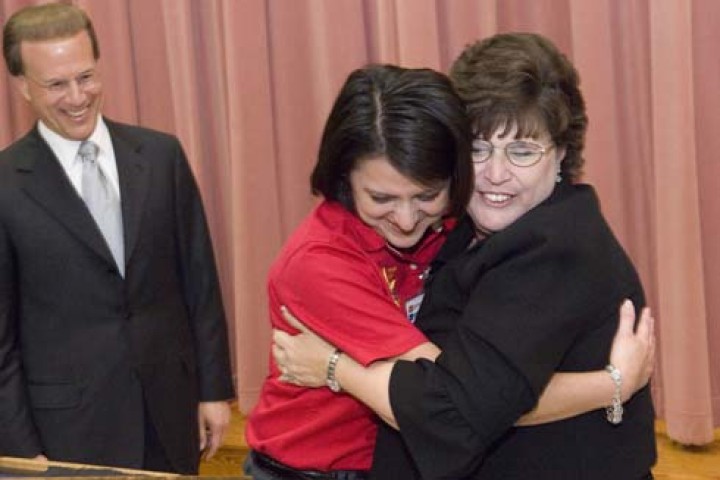 Alamo, Texas | Oct 17, 2008Milken Family Foundation Chairman Lowell Milken smiles as Claudia Peña hugs her principal, Sylvia S. Hernandez, after being surprised with a $25,000 Milken Educator Award.