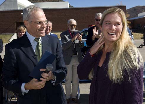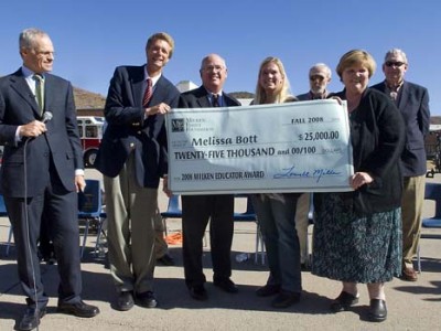 Park City, Utah | Oct 28, 2008Milken Family Foundation Executive Vice President Richard Sandler smiles as teacher Melissa Bott steps forward to accept a surprise $25,000 Milken Educator Award.