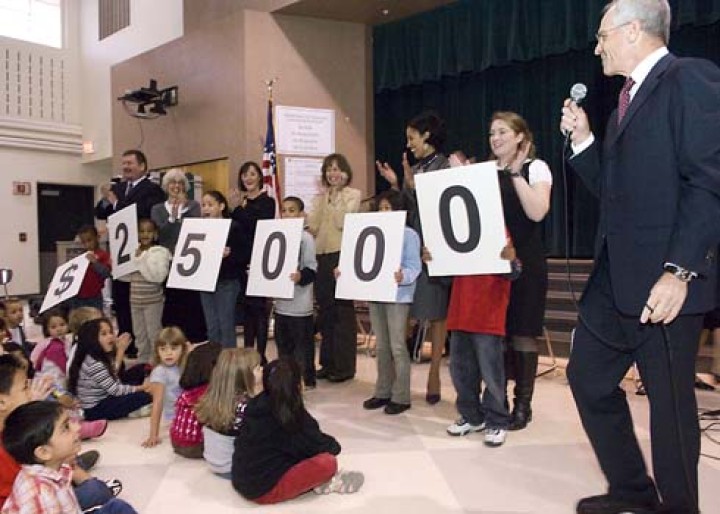 Renton, Washington | Oct 29, 2008Cascade Elementary students hold up cards displaying the amount of the Milken Educator Award as Milken Family Foundation Executive Vice President Richard Sandler prepares to announce the recipient of that amount. "And that educator is..."