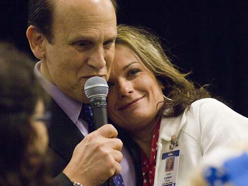 Henderson, Nevada | Dec 19, 2008Milken Family Foundation Co-Founder Michael Milken congratulates Principal Carrie Buck on her surprise $25,000 Milken Educator Award.