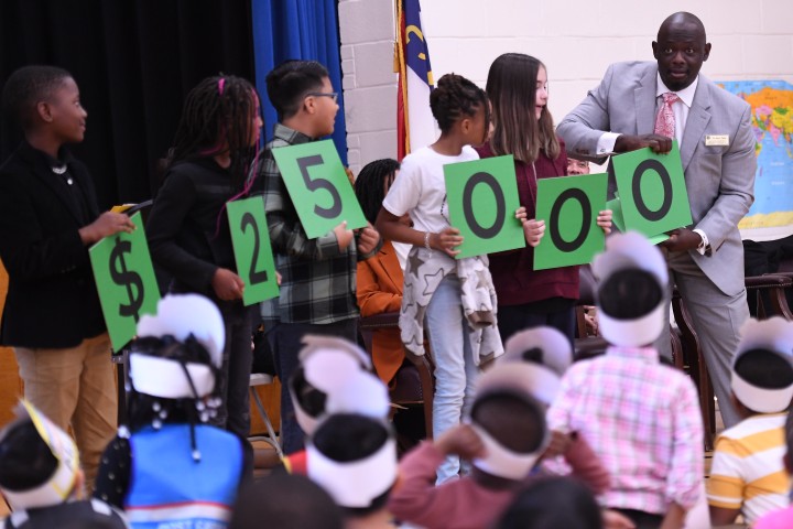 Pactolus Global School | Greenville, NC | Nov 03, 2023How much is the cash prize that accompanies the Milken Educator Award? Students hold up cards representing the amount. When North Carolina Department of Public Instruction Deputy Superintendent Dr. Jerry Oates reveals a third zero, the room starts to buzz: $25,000 is a lot of money!