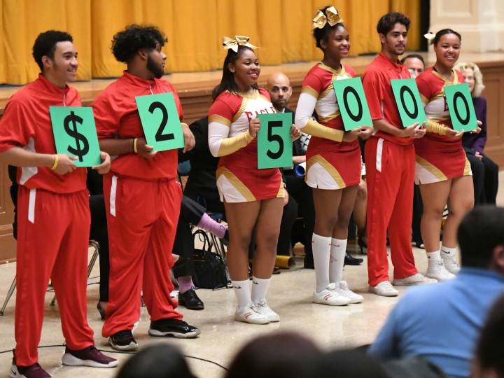 The Metropolitan Soundview High School | Bronx, NY | Oct 16, 2017The crowd gathered in the Bronx has just learned that one outstanding Metrosound educator is about to receive the Milken Educator Award...and a cash prize! How much? Students hold up cards representing the amount of the Award, one digit at a time. When the final zero appears, the room erupts in cheers: $25,000!