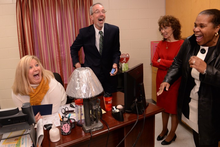 Pictured, from left: Krystle Bryant (AL '14), Alabama State Superintendent of Education Dr. Thomas Bice, Milken Educator Awards Senior Vice President Dr. Jane Foley and Tammy Alexander (AL '98).