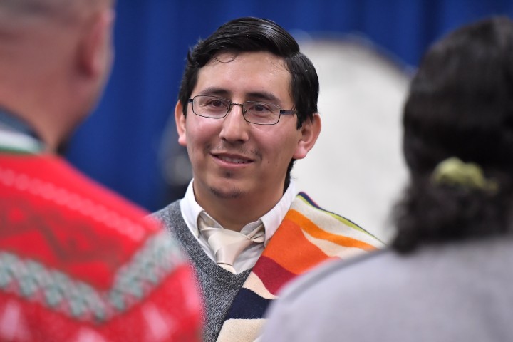 Todd County Middle School | Mission, SD | Dec 20, 2023Music teacher and Milken Educator Award recipient Albert Her Many Horses visits with guests at his surprise Award notification.