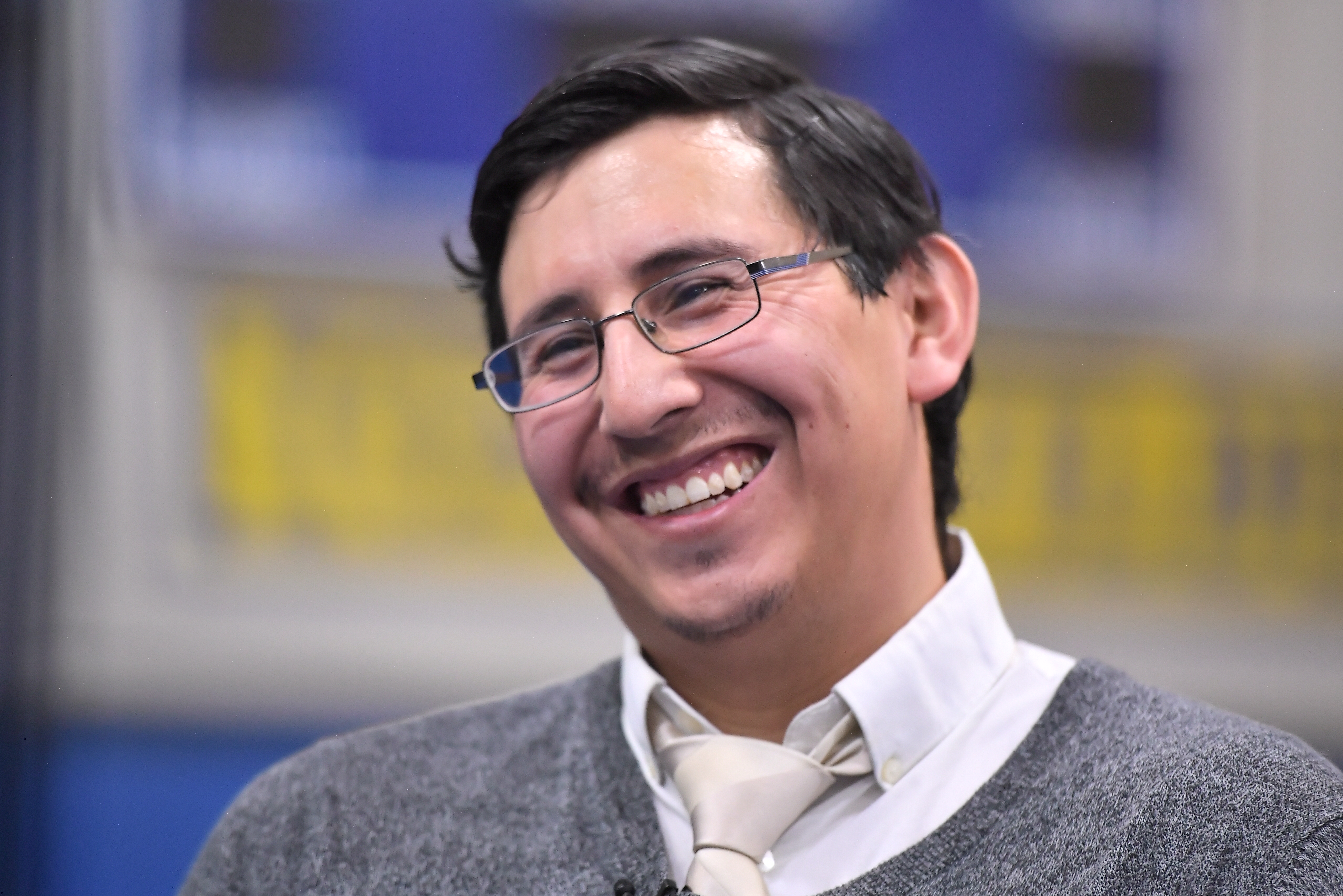 Todd County Middle School | Mission, SD | Dec 20, 2023Albert Her Many Horses answers questions during interviews after his surprise Milken Educator Award assembly.