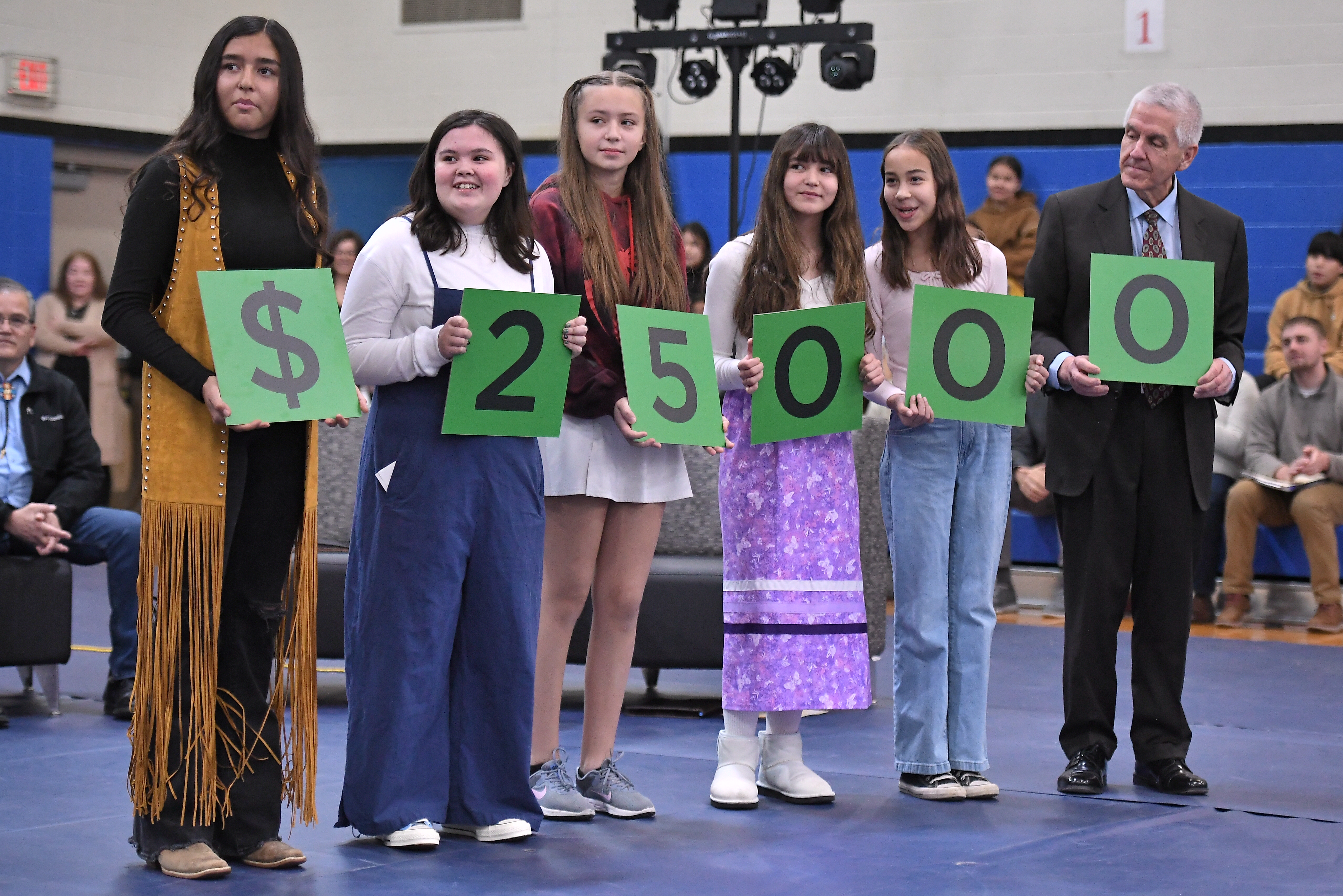Todd County Middle School | Mission, SD | Dec 20, 2023How much is the Milken Educator Award's financial prize? Students hold up cards representing the amount. When South Dakota Secretary of Education Dr. Joe Graves reveals a third zero, the room starts to hum: $25,000!