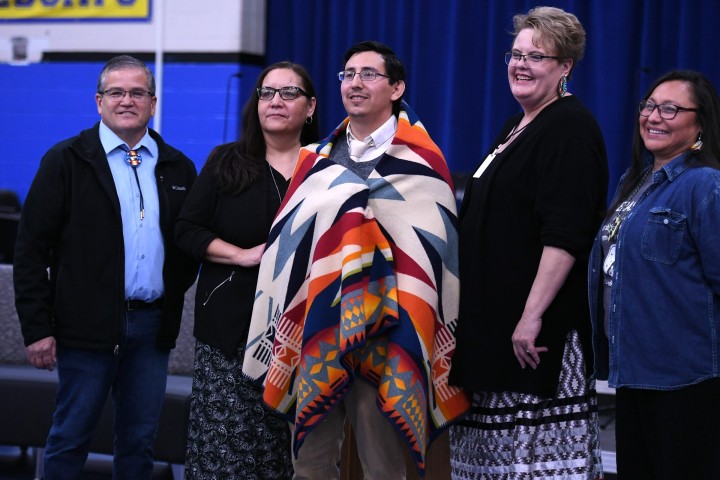 From left, Rosebud Sioux Tribe President Scott Herman; Todd County School District Superintendent Roberta Bizardie; recipient Albert Her Many Horses (SD '23); Todd County Middle School Principal Dana Haukaas; and Rosebud Sioux Tribe Education Department Tribal Education Specialist RoseMary Clairmont.