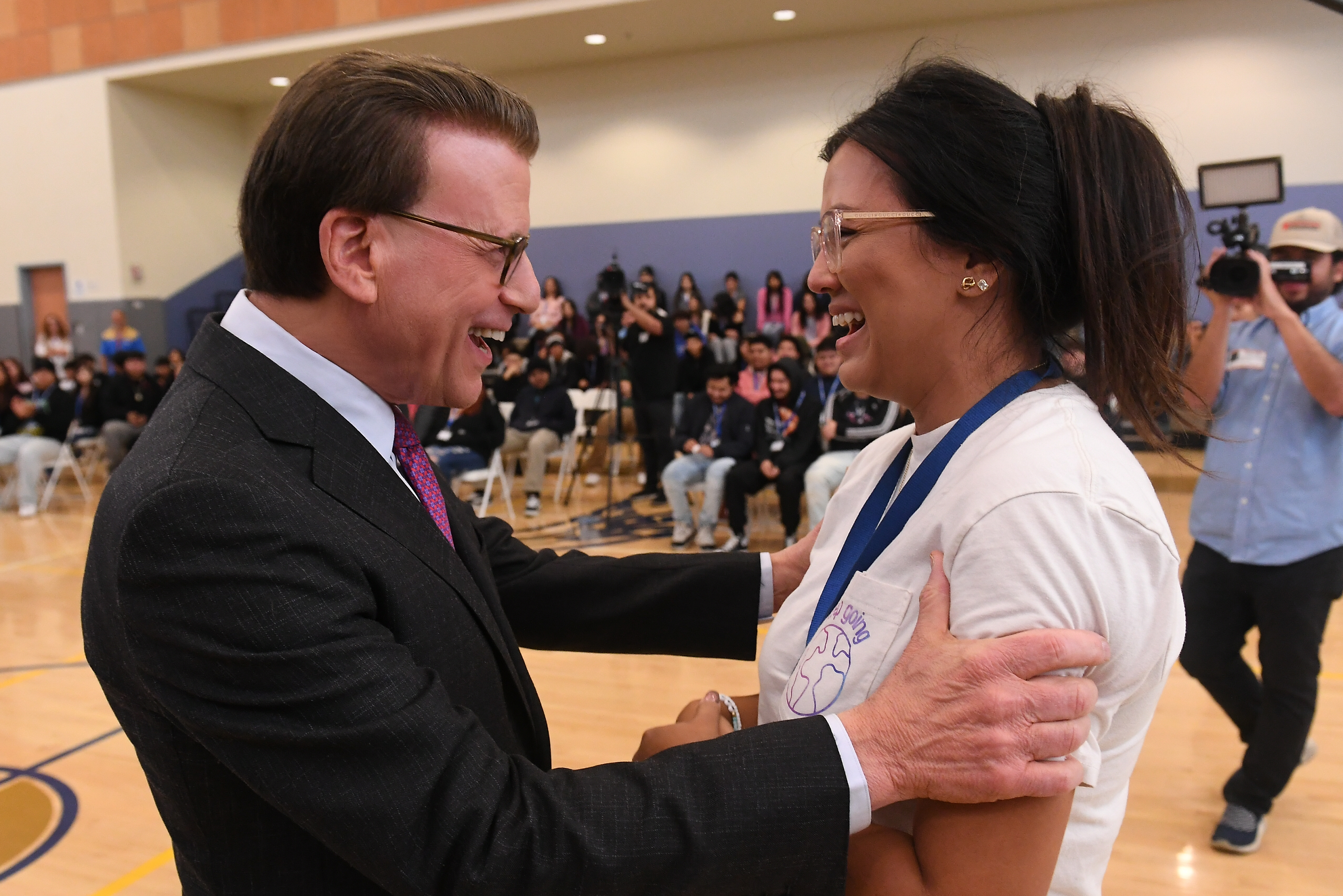 Amistad High School | Indio, CA | Nov 16, 2023Lowell Milken, founder of the Milken Educator Awards, congratulates recipient Alexis Arias. "This is not a lifetime achievement award," he says. "This award is to unleash lifetime achievement. We believe that you have the potential to accomplish even greater things in the future. So, I want to say on behalf of all the students and all of our dignitaries and this entire school district, congratulations and thank you for making education your chosen profession."