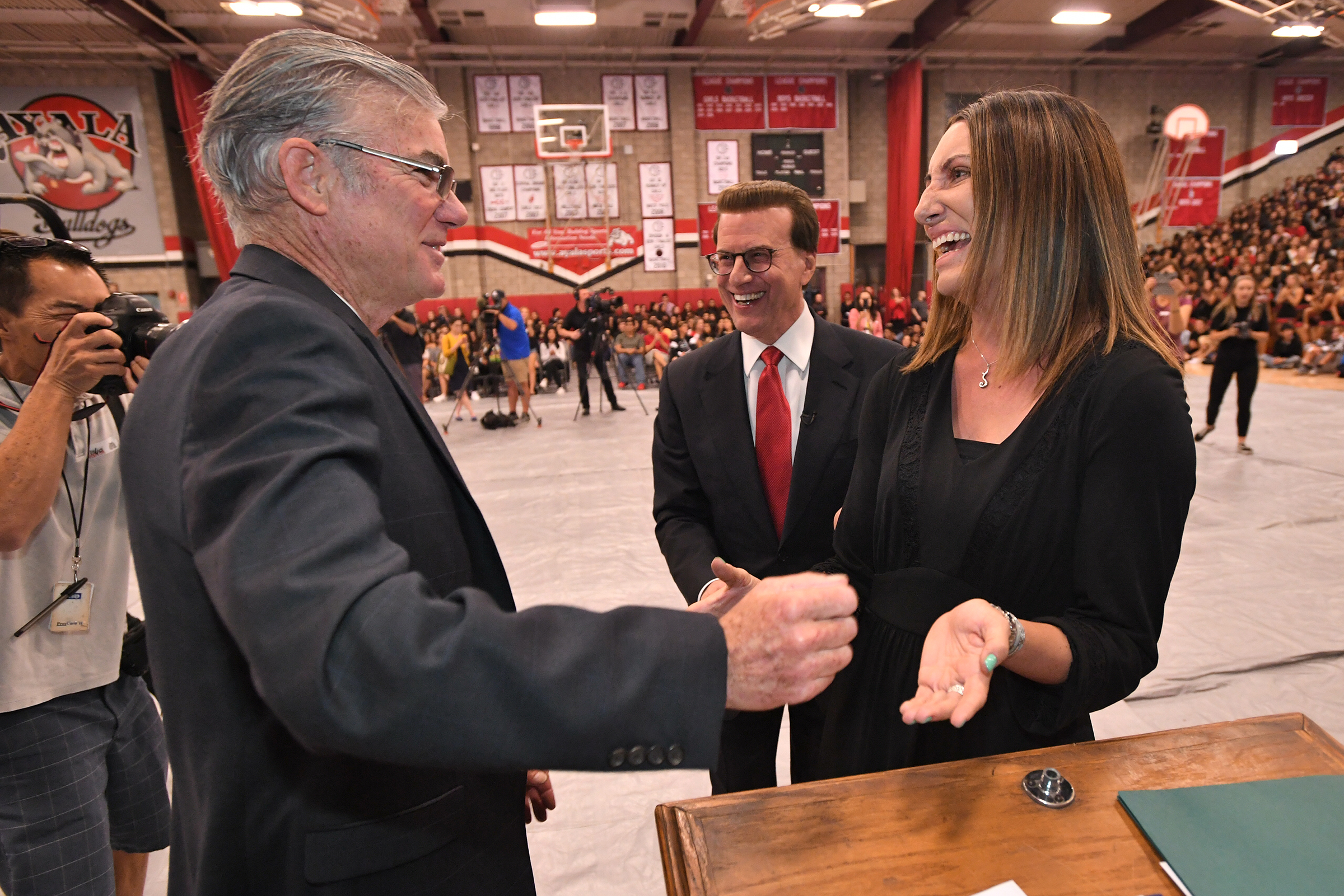 Ruben S. Ayala High School | Chino Hills, CA | Oct 10, 2017California Department of Education Superintendent Tom Torlakson (left) and Milken Family Foundation Chairman and Co-Founder Lowell Milken congratulate Alexis King, the newest member of the Milken Educator family. "It's truly an honor to join the outstanding team of educators and staff at Ruben S. Ayala High School to honor Alexis King," said Torlakson in a prepared statement. "This terrific teacher does great work every day and is a role model for instructors all over California. Congratulations on receiving the Milken Educator Award and joining this elite national team of remarkable teachers." Torlakson started his public service career as a high school science teacher and coach.