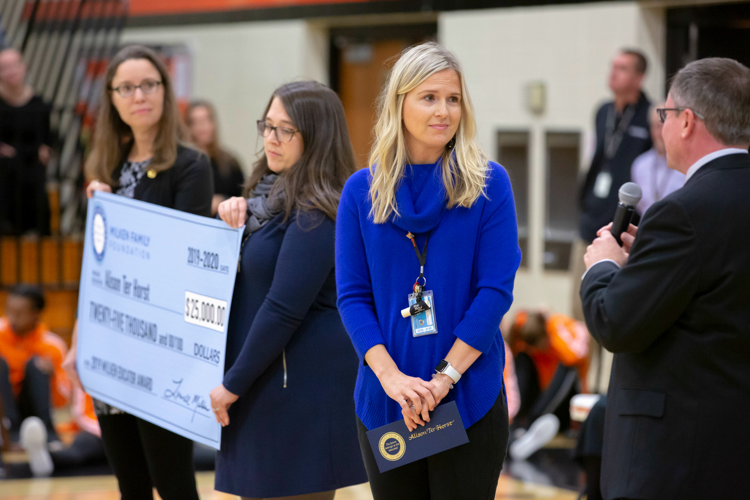 Washington High School | Sioux Falls, SD | Oct 16, 2019South Dakota Secretary of Education Ben Jones congratulates Alison Ter Horst on her Milken Educator Award. "Too often, teachers are unsung heroes, quietly going about their important work, inspiring young lives," says Jones. "I hope we all remember the celebratory spirit of today with its schoolwide assembly and musical numbers, and strive to always be vocal with our appreciation of educators." Holding Alison's oversized Milken Award check are veteran Milken Educators Gina Benz (SD '15, left) and Kira Christensen Dylla (SD '09).