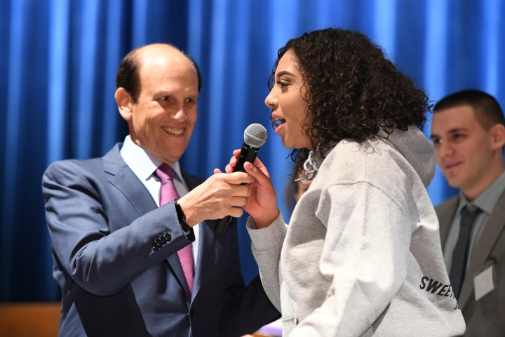 Annapolis High School | Annapolis, MD | Jan 24, 2018Mike Milken, co-founder of the Milken Family Foundation, talks with a student as he reveals the real reason for the day's festivities.