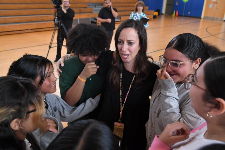 John S. Martinez Sea and Sky STEM Magnet School | New Haven, CT | Oct 18, 2023In an emotional moment, Milken Educator Alyssa Granata-Basso (CT '23) huddles with John S. Martinez Sea and Sky STEM Magnet School to celebrate her Award. A lifelong advocate for students, she helps develop young leaders by advising and co-facilitating student council. Her guidance helps students navigate elections, school planning and community event organization each year. "All I ever want for you is to work hard and be leaders in our building," Mrs. Granata-Basso said to them today.