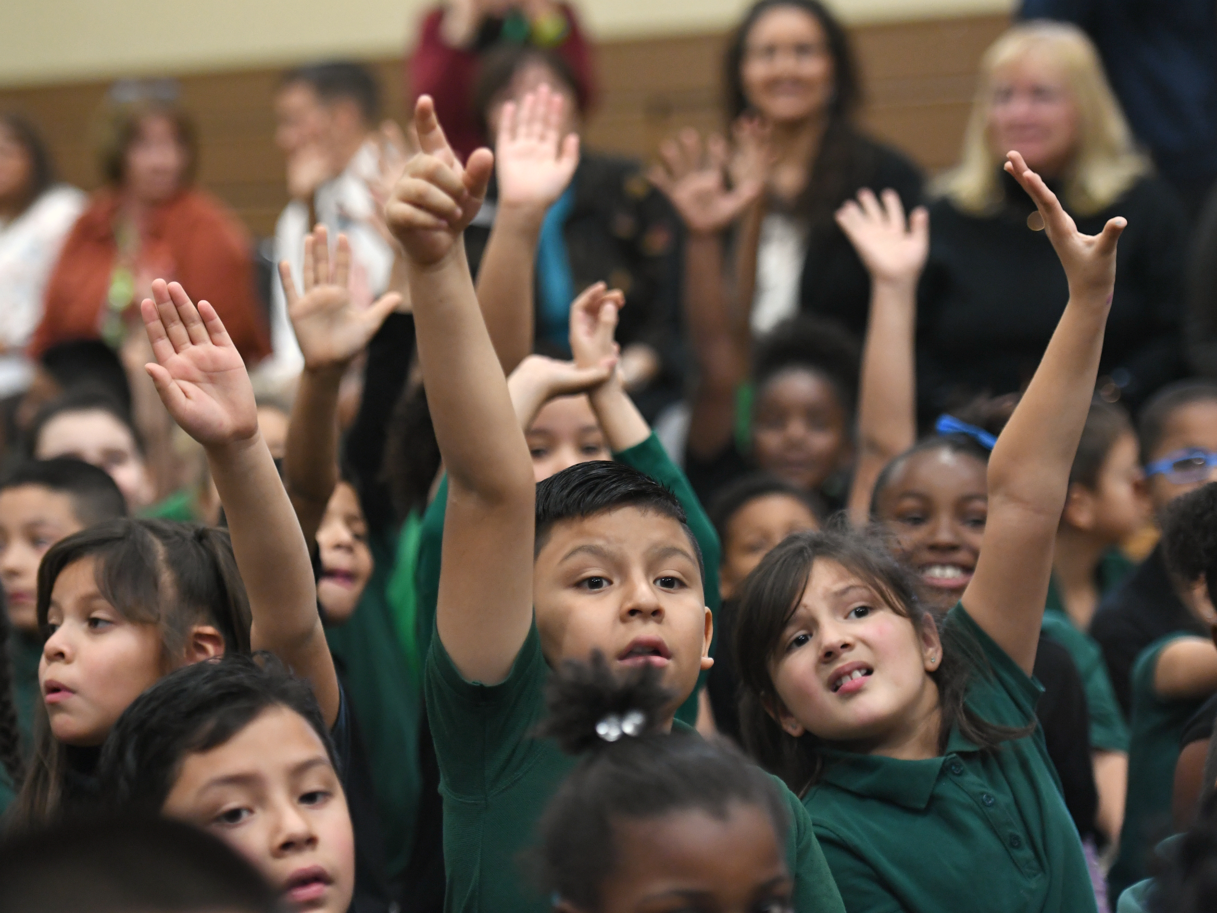 Hilldale Elementary School | Oklahoma City, OK | Jan 10, 2017PLEASE PICK ME! When Milken Family Foundation Senior Program Administrator Greg Gallagher asks for volunteers from the audience to help him with his presentation, hands shoot up eagerly around the gymnasium.