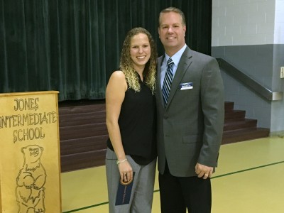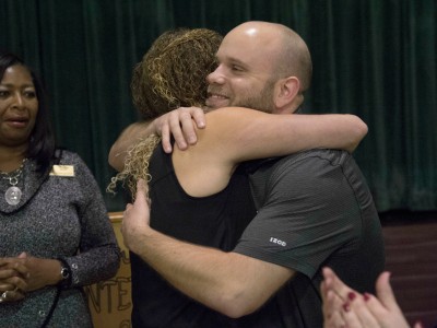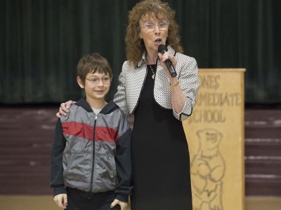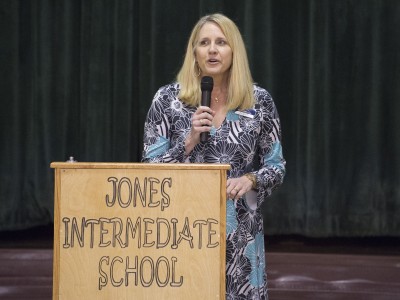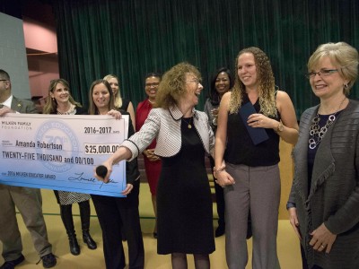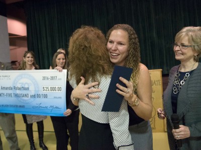 The gymnasium at Jones Intermediate School is abuzz: North Carolina Superintendent of Public Instruction Dr. June Atkinson and Mount Airy City Schools Superintendent Dr. Kim Morrison have joined the morning assembly to commend the school on its Leader in Me program. But is there another reason for their visit? When Atkinson introduces Dr. Jane Foley, senior vice president of the Milken Educator Awards, the crowd realizes something big is about to happen. Foley and Atkinson present fourth-grade math teacher Amanda Robertson with North Carolina's 2016-17 Milken Educator Award, giving this outstanding educator the surprise of a lifetime. Follow along in our photo gallery.