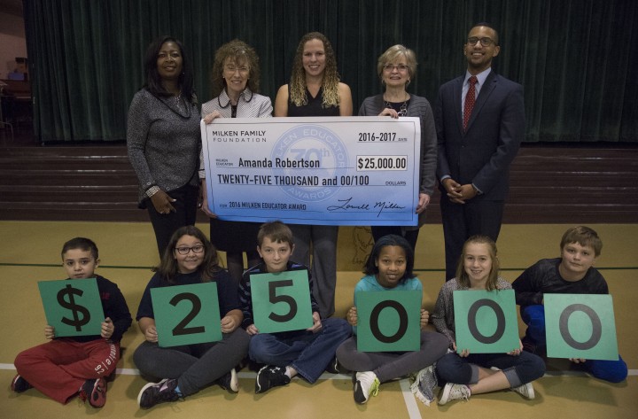 Jones Intermediate School | Mount Airy, NC | Dec 08, 2016Visiting dignitaries give fourth-grade teacher Amanda Robertson a hand with her oversized $25,000 Milken Educator Award check.