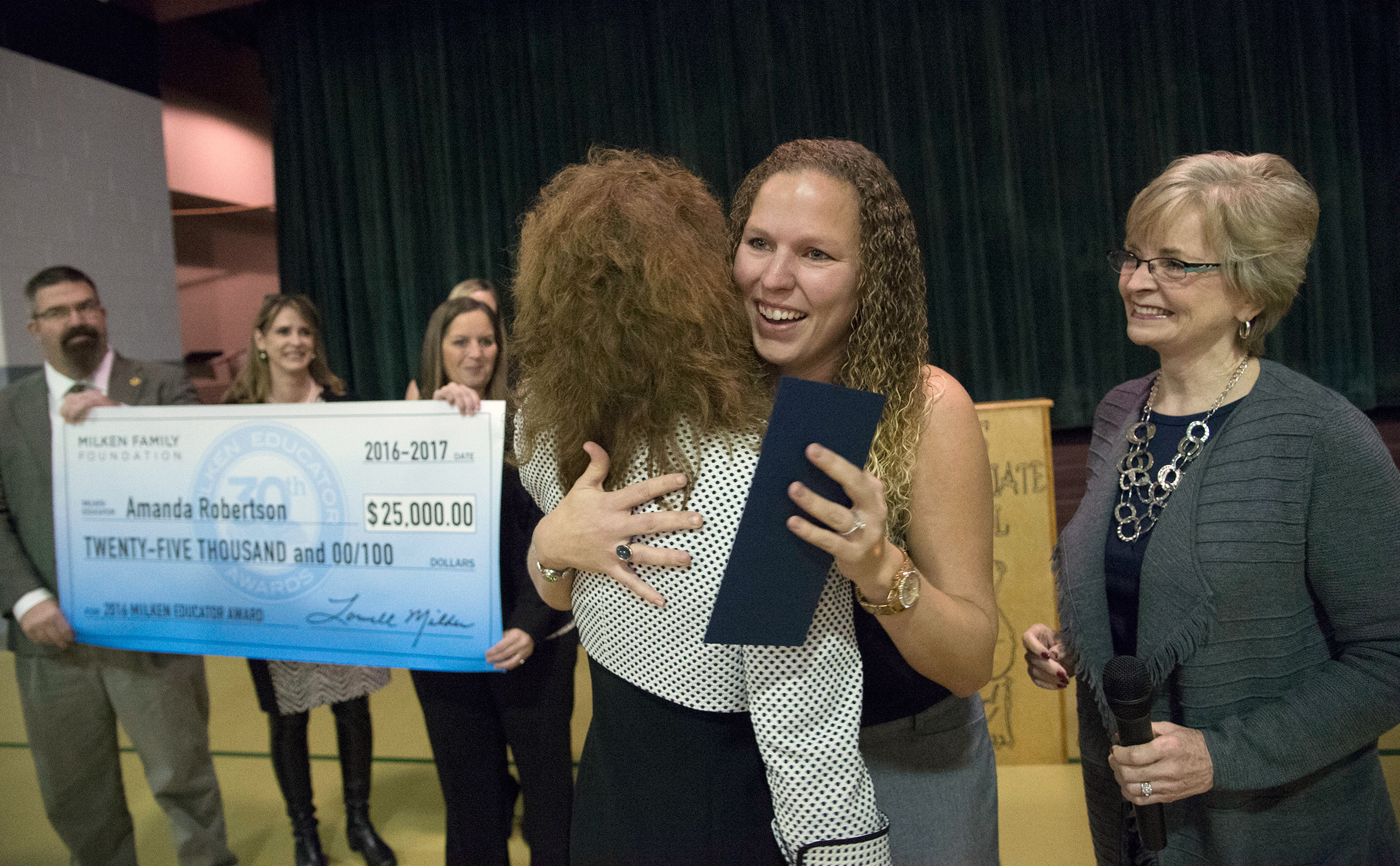 Jones Intermediate School | Mount Airy, NC | Dec 08, 2016Dr. Jane Foley, senior vice president of the Milken Educator Awards, congratulates fourth-grade teacher Amanda Robertson on her Milken Educator Award. Dr. June Atkinson, North Carolina's superintendent of public instruction, and veteran Milken Educators look on proudly.