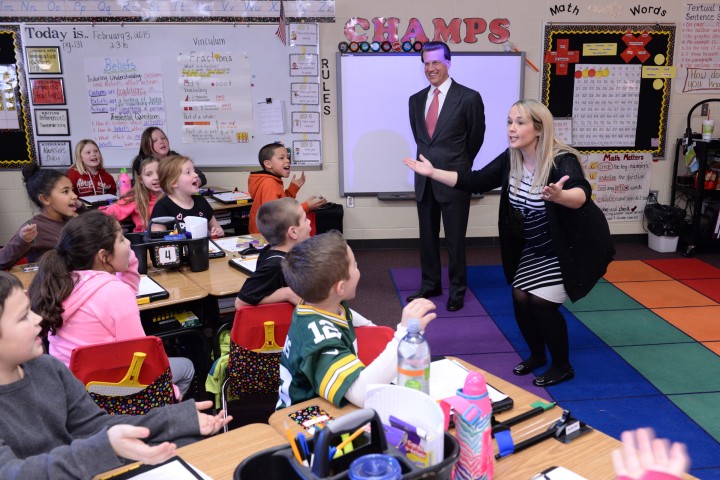 Dodge Literacy Magnet Elementary School | Wichita, KS | Feb 03, 2015Returning to her classroom, Milken Family Foundation Chairman and Co-Founder Lowell Milken watches as Amy Stanislowski uses her entire body to get students excited about fractions.