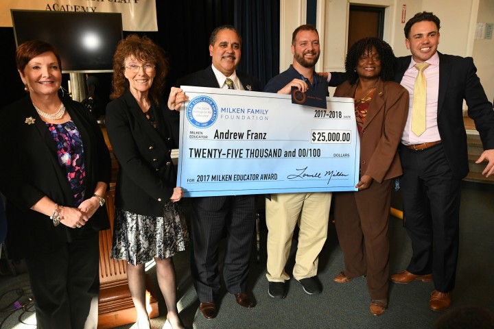 From left, Buffalo Public School District Associate Superintendent for Elementary School Leadership Margaret Boorady; Dr. Jane Foley, senior vice president of the Milken Educator Awards; Buffalo Public School District Superintendent Dr. Kriner Cash; recipient Andrew Franz (NY '17); Sharon Belton-Cottman, Ferry District representative and vice president of executive affairs for Buffalo Public School District; and Hamlin Park Claude and Ouida Clapp Academy Principal Patrick Cook.
