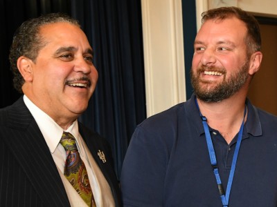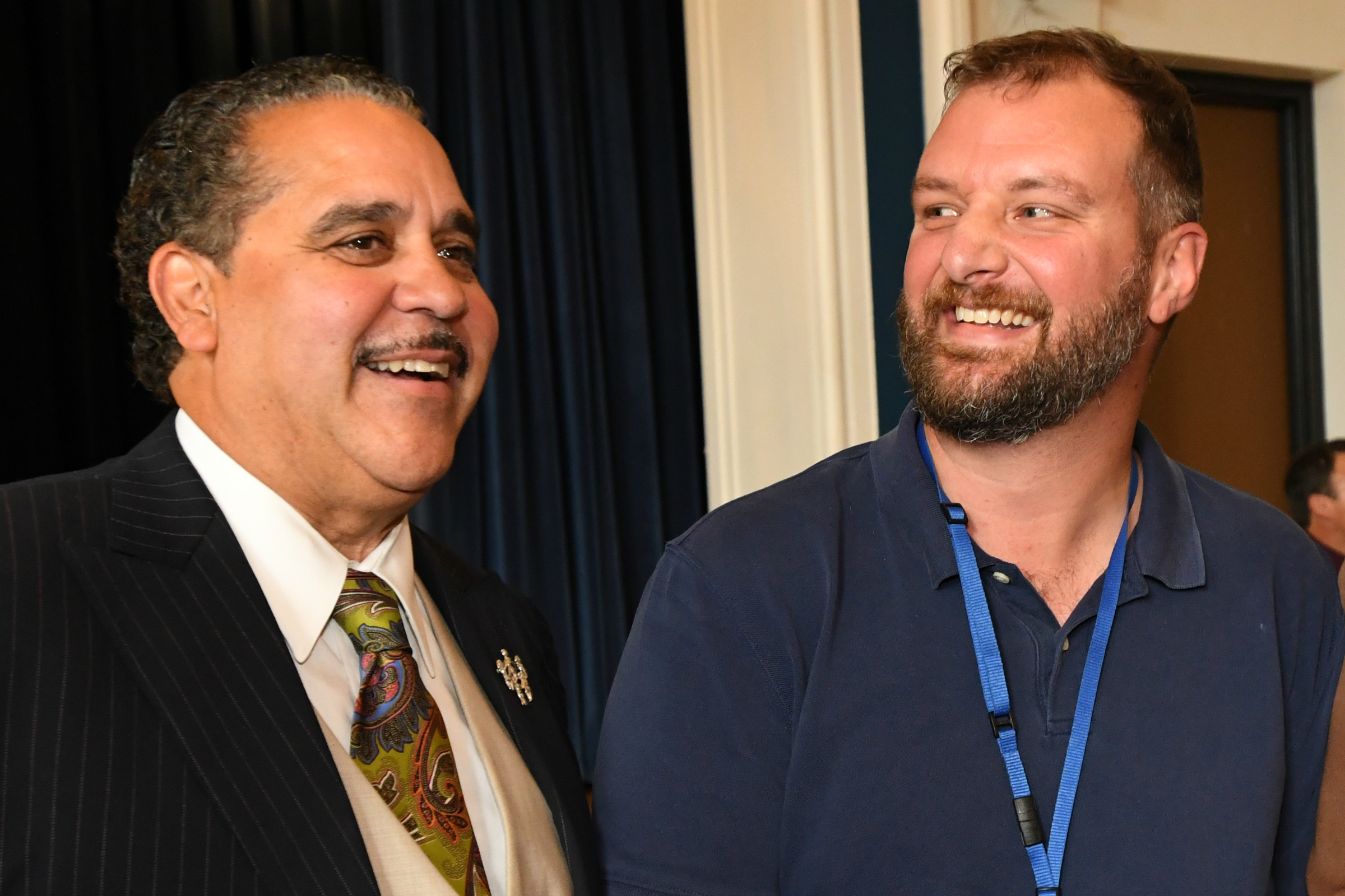 Hamlin Park Claude and Ouida Clapp Academy | Buffalo, NY | Oct 16, 2017Buffalo Public School District Superintendent Dr. Kriner Cash (left) congratulates special education teacher Andrew Franz on his Milken Educator Award. Franz is one of western New York’s biggest advocates for STEM education. As the lead educator on the Student Spaceflight Experiment Project for seventh- and eighth-graders, Franz helped students examine the effects of microgravity and space travel in an experiment on potato farming that traveled to the International Space Station on the Falcon 9 Rocket in February 2017.