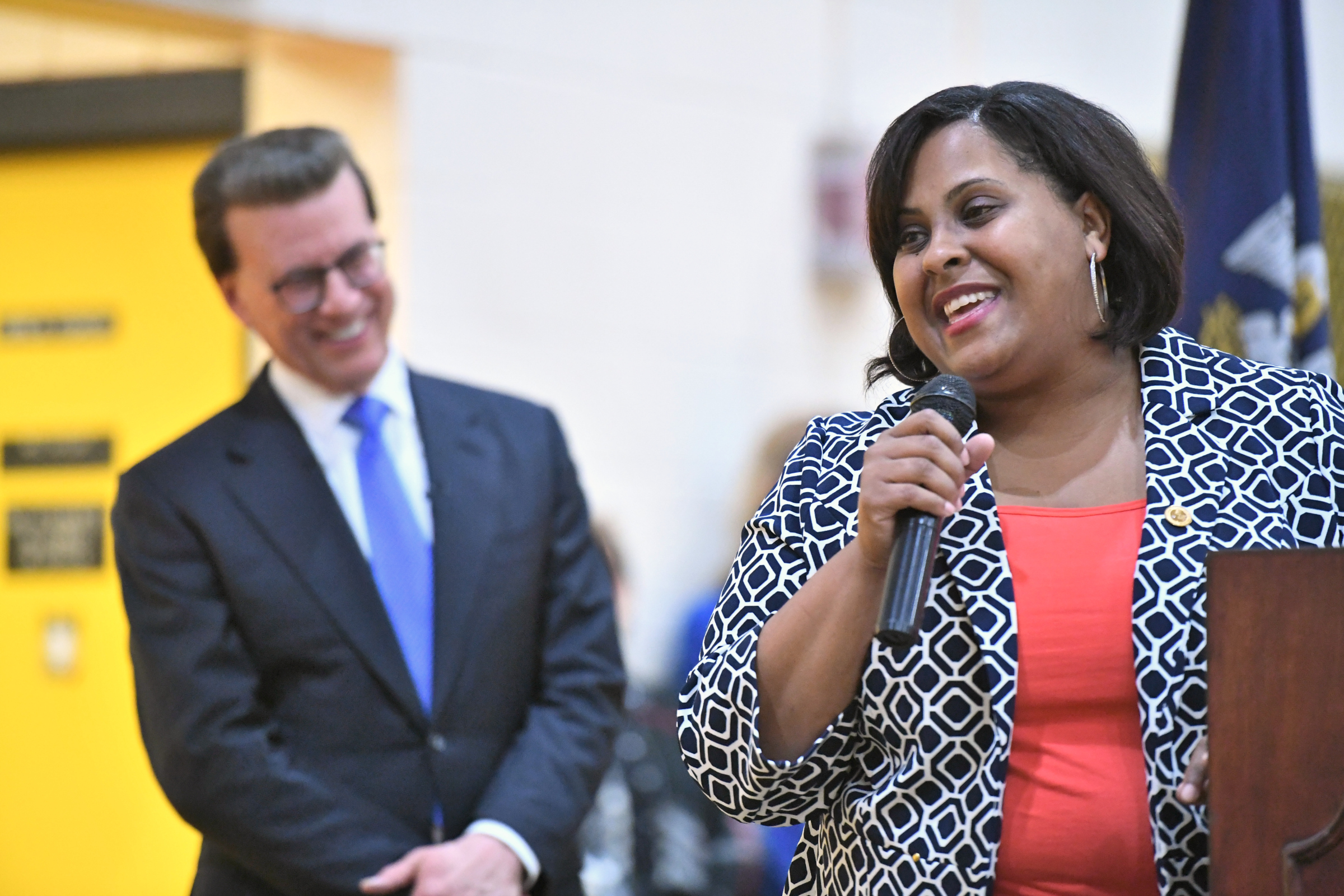 Edgar Martin Middle School | Lafayette, LA | Dec 07, 2017"Remember this moment, because it is amazing—and it opens so many doors," says Milken Educator Devon Willis-Jones (LA '16), the principal of Jeanerette Elementary School. Lowell Milken, chairman and co-founder of the Milken Family Foundation, looks on.