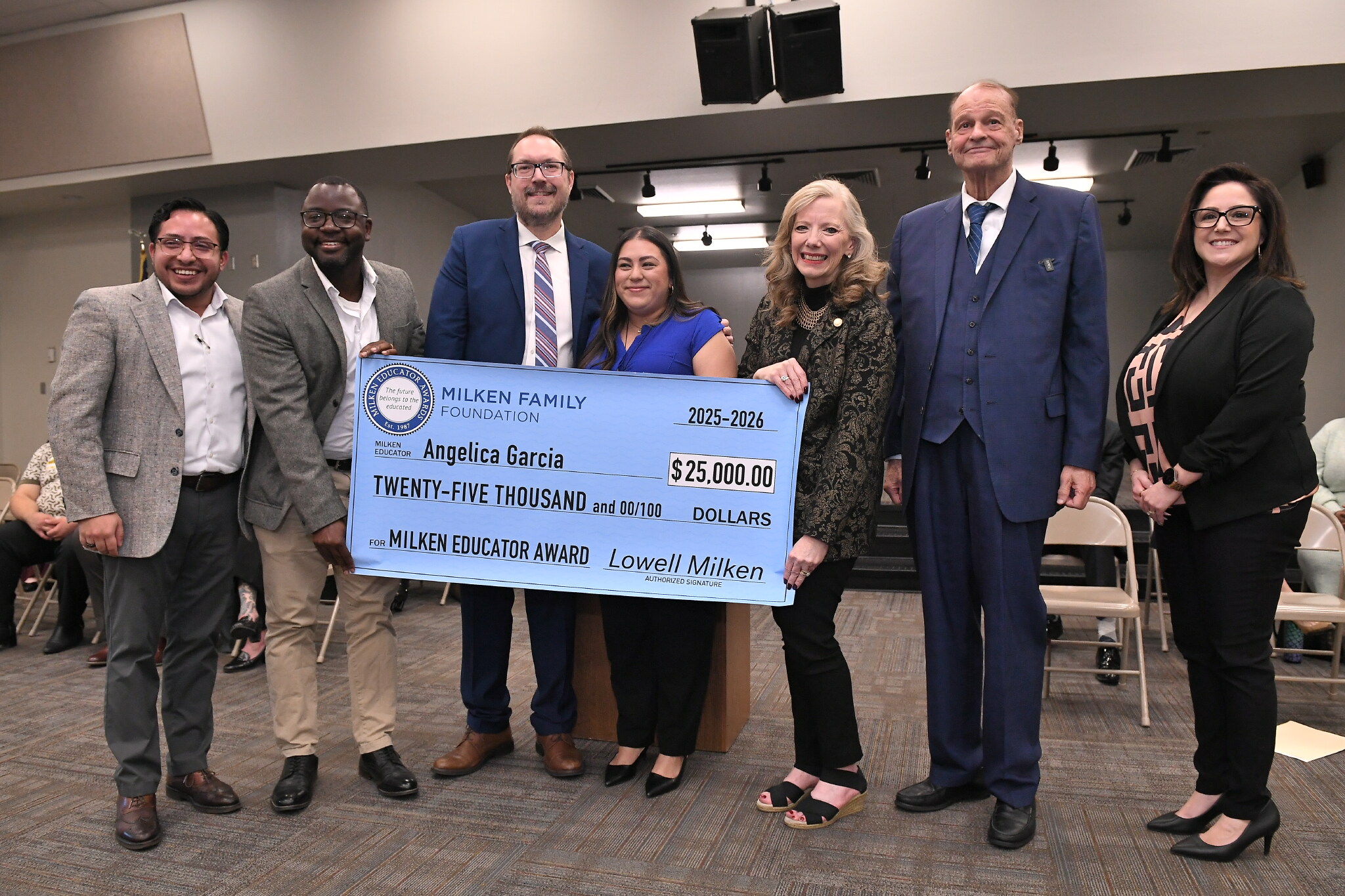 Westwood Elementary School | Phoenix, AZ | Jan 15, 2026Milken Educator Award recipient Angelica Garcia gets a hand with her oversized check.