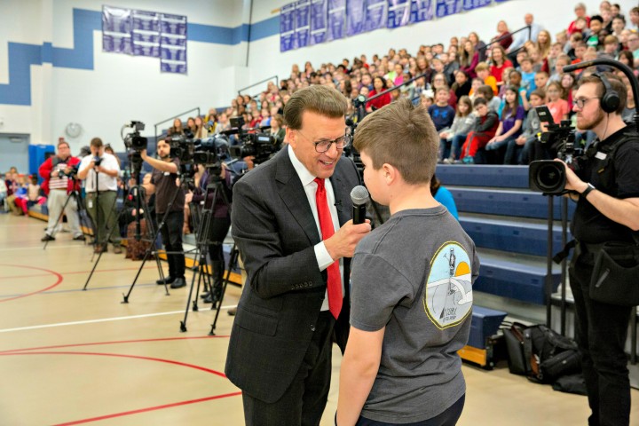 Peaks Mill Elementary | Frankfort, KY | Feb 11, 2019TELL US MORE! Lowell Milken, chairman and co-founder of the Milken Family Foundation, asks a student to help him with his presentation.