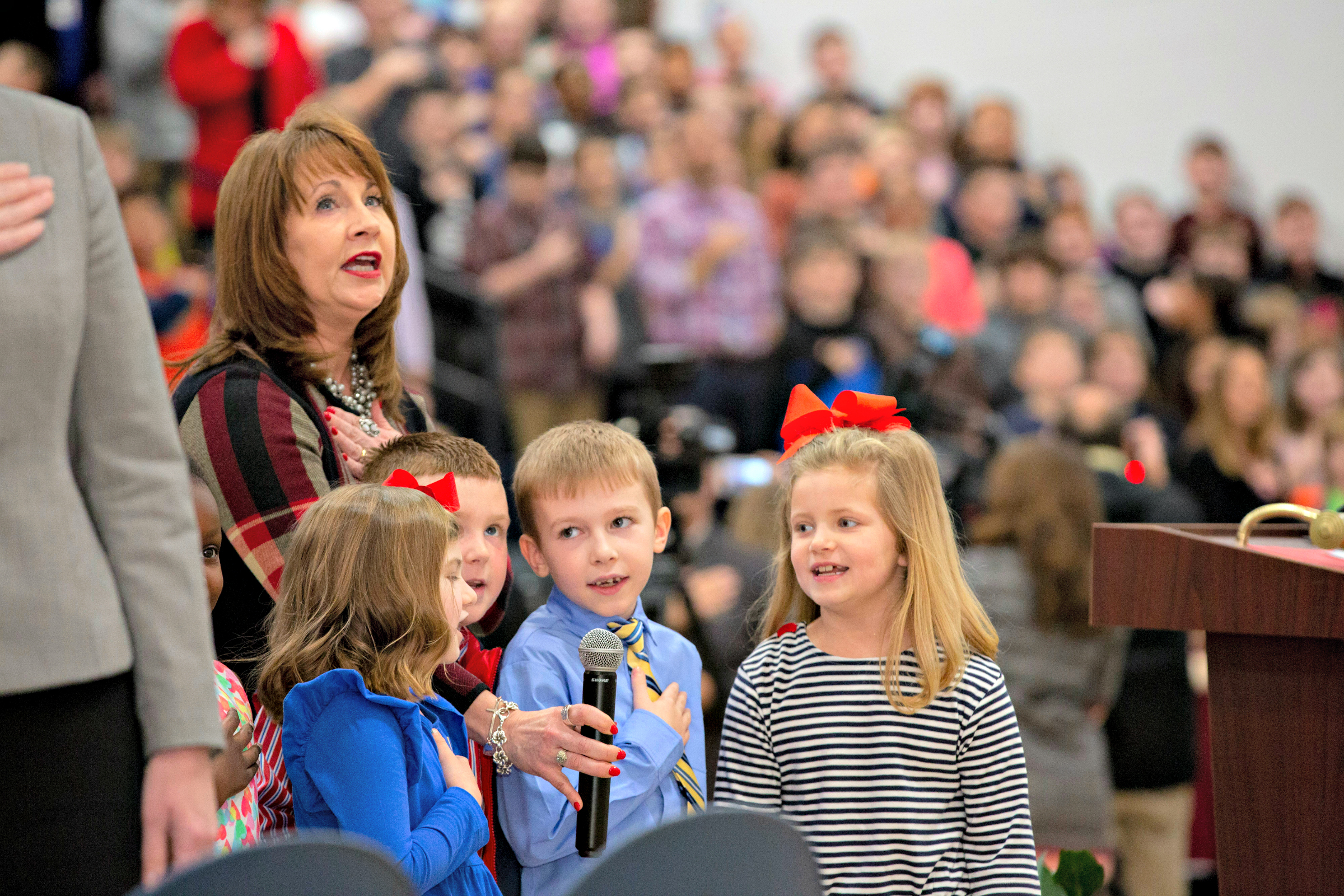 Peaks Mill Elementary | Frankfort, KY | Feb 11, 2019Peaks Mill Elementary Principal Dana Blankenship holds the microphone as first-graders lead the Pledge of Allegiance.