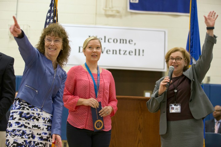 From left, Dr. Jane Foley, senior vice president of the Milken Educator Awards; recipient Anna Capobianco; and Connecticut State Education Commissioner Dr. Dianna R. Wentzell.