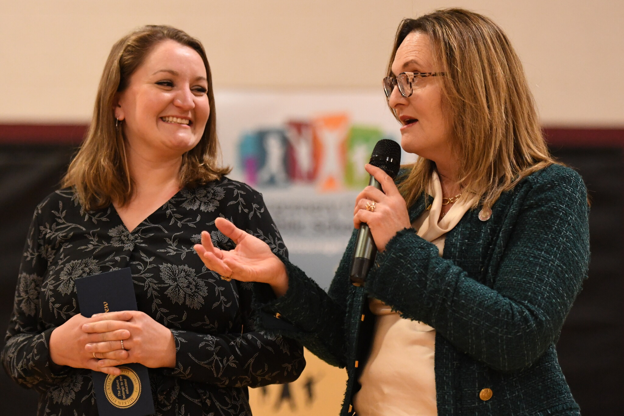 Shawsville Middle School | Shawsville , VA | Mar 07, 2025Virginia Superintendent of Public Instruction Dr. Lisa Coons congratulates Anna Drew.