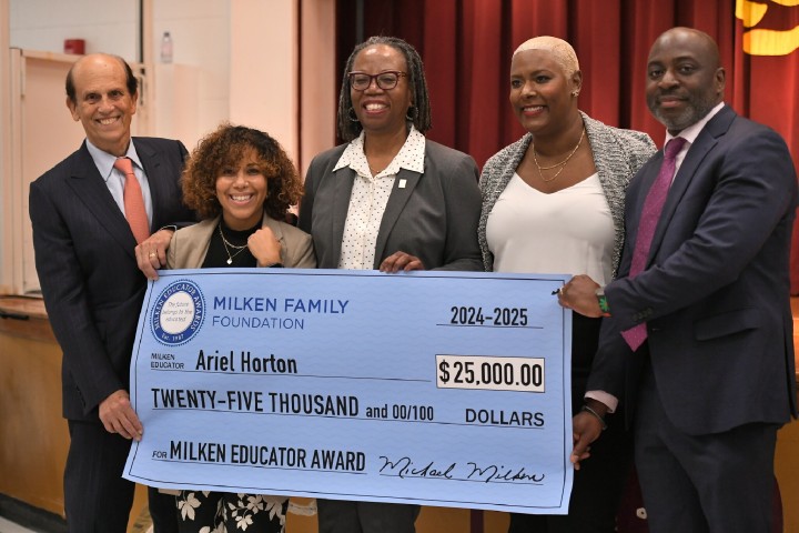 From left: Mike Milken, president and co-founder of the Milken Family Foundation; recipient Ariel Horton (DC '24); D.C. Interim State Superintendent of Education Dr. Antoinette S. Mitchell; D.C. Public Schools Chief of External Affairs Kera Tyler; and Noyes Elementary School Principal Kermit Burks.