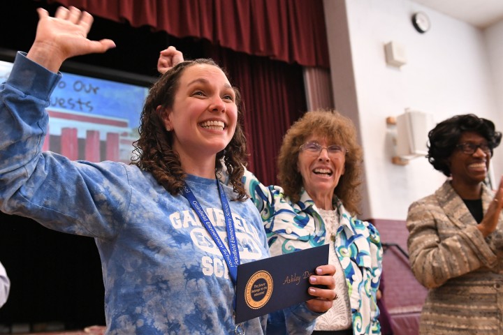 Gainfield Elementary School | Southbury, CT | Oct 18, 2023With Milken Educator Awards Senior Vice President Dr. Jane Foley and Connecticut Education Commissioner Charlene M. Russell-Tucker looking on, Milken Award recipient Ashley Dunne turns to wave to her cheering students and Gainfield Elementary community, holding the envelope bearing her name in shiny gold print.