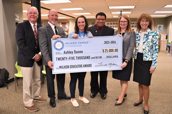 From left, Michael Rafferty (CT ’99); Ross Sward (CT '03); recipient Ashley Dunne (CT '23); Manuel Zaldivar (CT '16); Karen Cook (CT ’05); and Dr. Jane Foley (IN '94), senior vice president of the Milken Educator Awards.