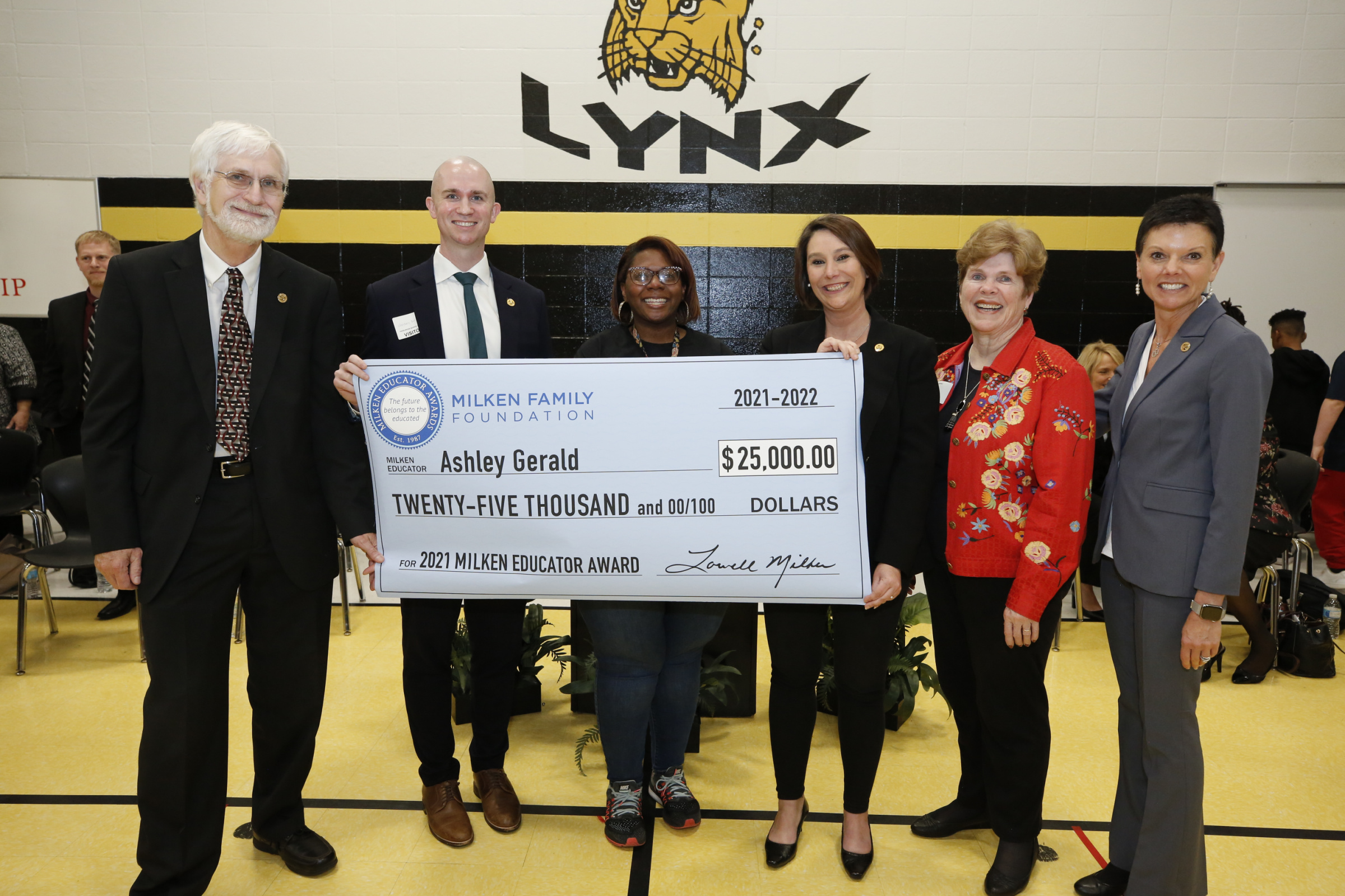 From left, Mark Lueckenhoff (MO '96); Jordan McGaughey (MO '17); recipient Ashley Gerald (MO '21); Melissa Fike (MO '19); Pam Stanfield (MO '96); and Stephanie Bishop (VA '01), vice president of the Milken Educator Awards.