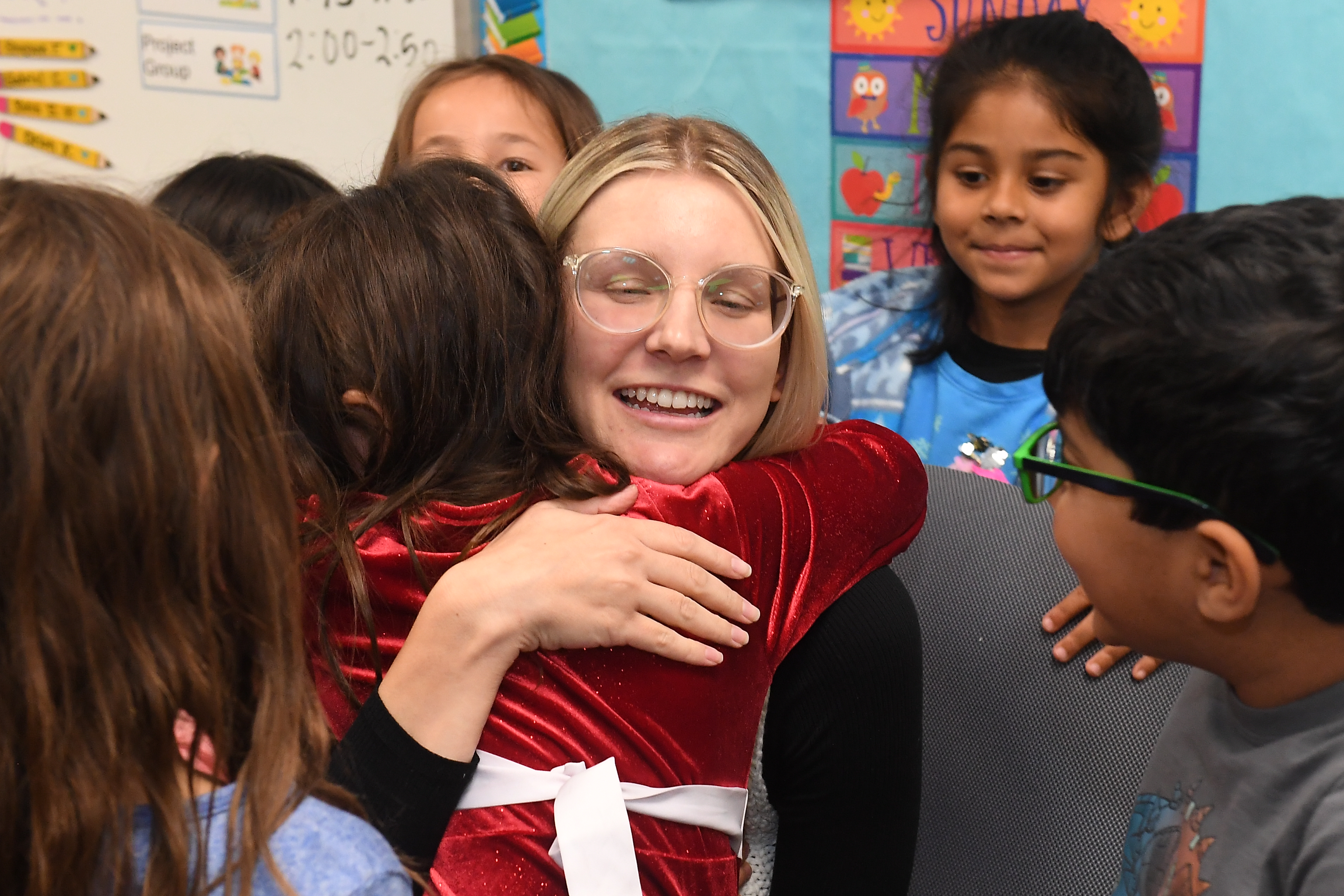 Horizon Honors Elementary School | Phoenix, AZ | Dec 07, 2023First and second grade mentor teacher Ashley Meyer hugs students tightly as they celebrate her surprise Milken Educator Award.
