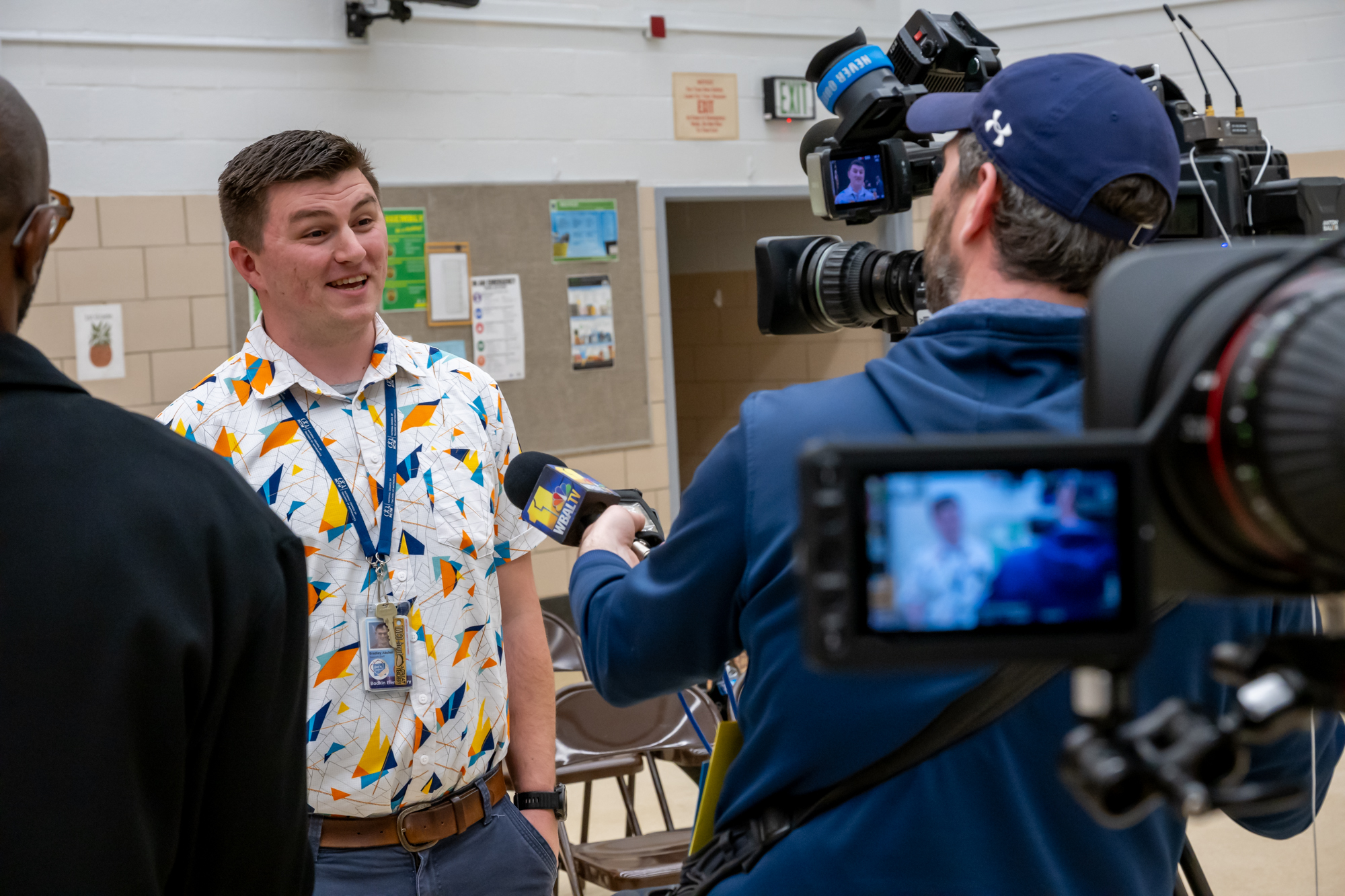 Bodkin Elementary School | Pasadena, MD | Apr 18, 2024Milken Educator Award recipient Bradley Absher talks with reporters at his surprise notification. In addition to his duties in the classroom, Absher mentors not only his own students but also others in the school, offering after-school tutoring and unwavering support to all students. He also spearheads various clubs including STEM, SeaPerch, Math Mindset and both the board game and chess clubs.