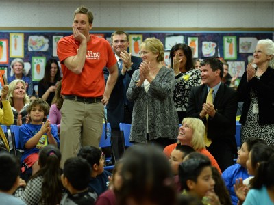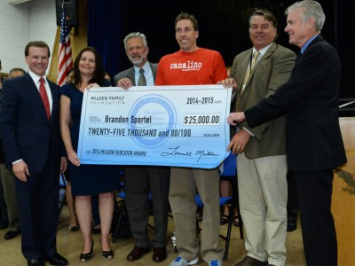 Special education teacher Brandon Sportel's career has just been taken to a whole new level! Flip through our gallery to see the special assembly in Brandon's honor and his reaction when Milken Family Foundation Co-Founder Lowell Milken and California State Superintendent of Public Instruction Tom Torlakson surprise him with a $25,000 "thank you!”