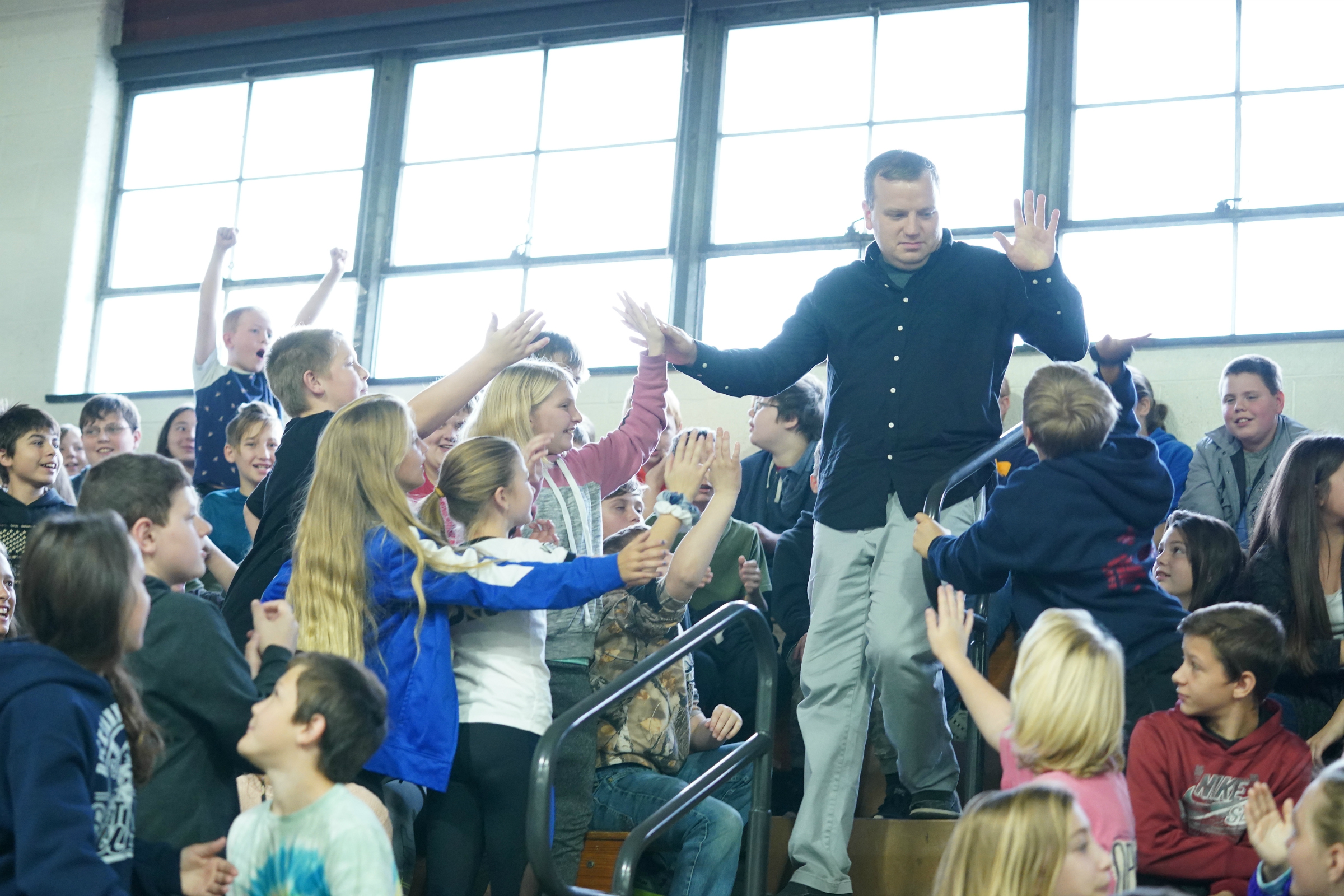Buckhannon-Upshur Middle School | Buckhannon, WV | Nov 07, 2019THAT'S OUR TEACHER! Excited students reach out their hands to high-five social studies teacher and newly minted Milken Educator Brian Allman.