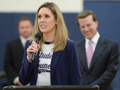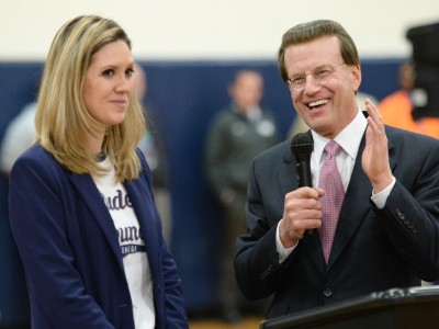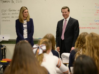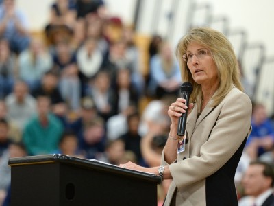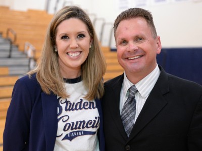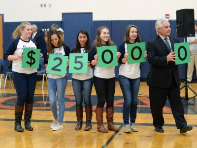 Cienega High School | Vail, AZ | Nov 16, 2015Visiting dignitaries, veteran Milken Educators and the Cienega High School bobcat mascot give Milken Educator Award winner Brittany Matsushino some help holding up her oversized $25,000 award check. From left, Arizona Deputy Superintendent Shari Zara; Dr. Manuel Valenzuela (AZ '98), Sahuarita Unified School District superintendent; the Cienega High School bobcat mascot; recipient Brittany Matsushino (AZ '15); Bradley Breuer (AZ '10), second-grade teacher at Pedro Guerrero Elementary School in Mesa; and Lowell Milken, chairman and co-founder of the Milken Family Foundation.