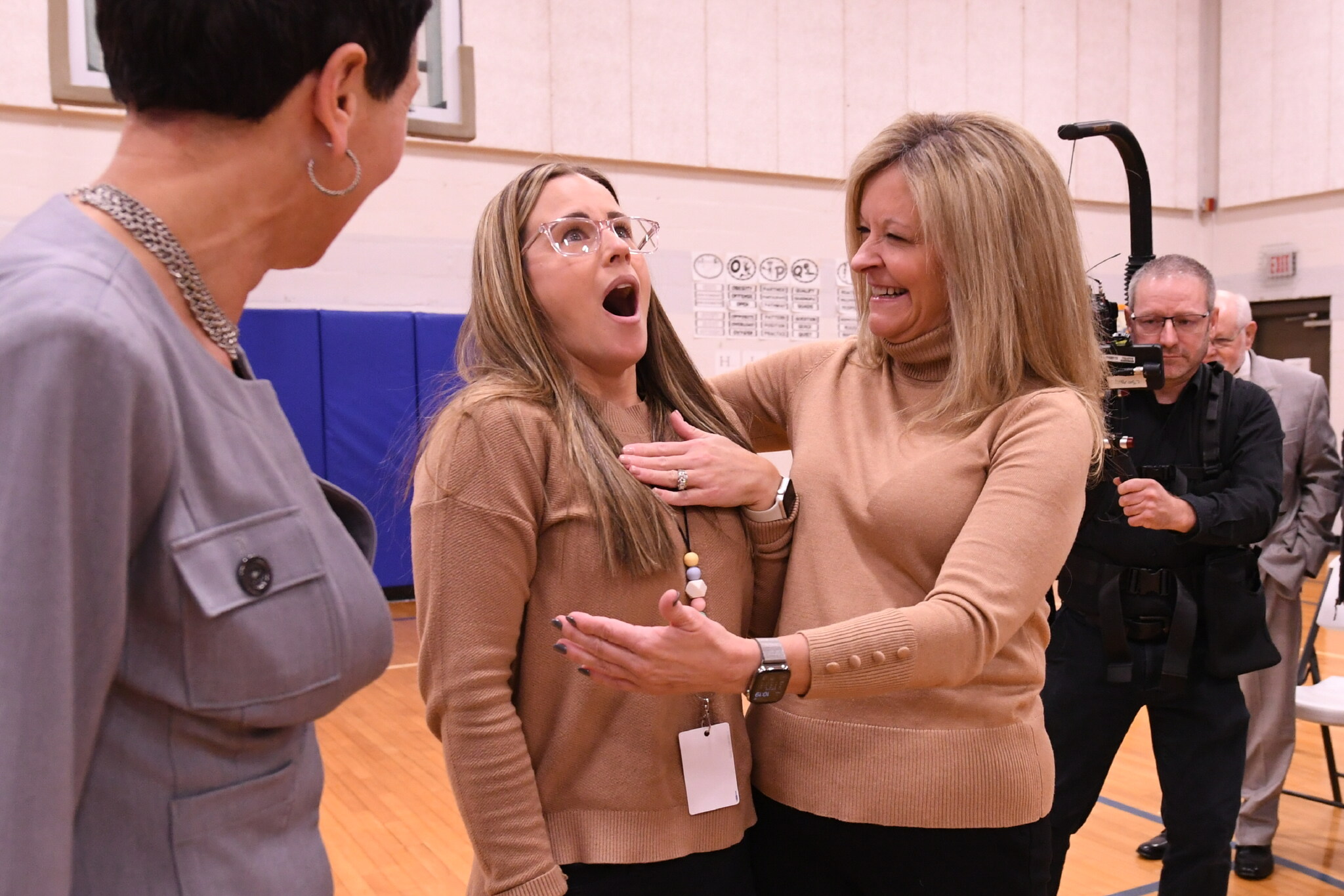 Mullens Elementary School | Mullens, WV | Nov 18, 2025West Virginia State Superintendent of Schools Michele L. Blatt congratulates Brooke Bailey with a hug while Milken Educator Awards Vice President Stephanie Bishop proudly looks on.