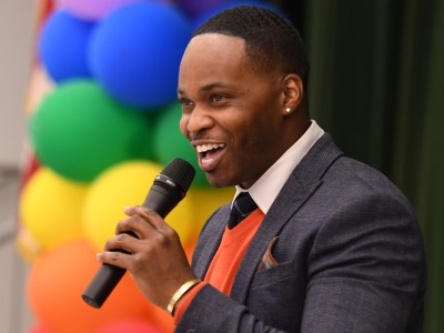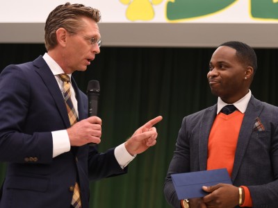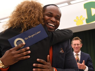 It's starting to sink in for Principal Cutter — he is an Alabama Milken Educator, and the $25,000 check at the front of the room has his name on it!