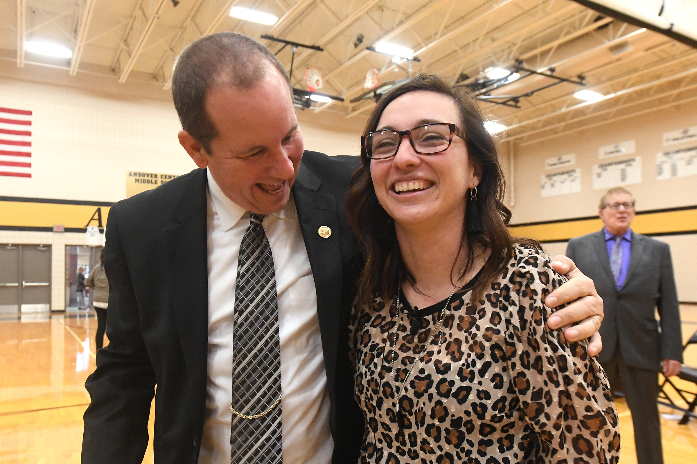 Andover Central Middle School | Andover, KS | Jan 09, 2020Carly Bowden gets a special hug from veteran Milken Educator Brad Nicks (KS '09), the high school math teacher who inspired her to become an educator. A decade ago, when Brad received the Award at Shawnee Heights High School in Tecumseh, Carly was there for his Milken Award surprise!
