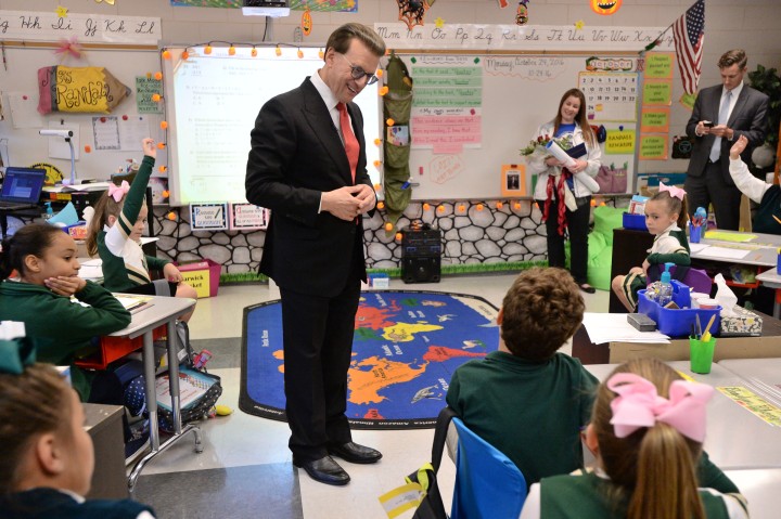 Joseph J. Davies Elementary School | Meraux, LA | Oct 24, 2016Lowell Milken, chairman and co-founder of the Milken Family Foundation, talks with Milken Educator Award Recipient Catherine Randall's third-graders in their classroom. "You must have a great teacher!", he says to the students, who clearly adore Randall. Adds one child: "And she's beautiful!"