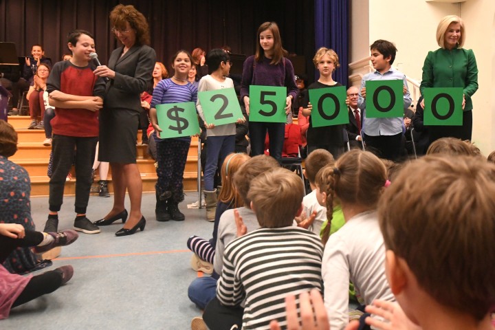 Ann Arbor Open School | Ann Arbor, Michigan | Dec 12, 2018The teacher who is about to win a Milken Educator Award also gets a cash prize. One digit at a time, Dr. Jane Foley, senior vice president of the Milken Educator Awards, has students hold up cards representing the amount of the Award. When Michigan Chief Deputy Superintendent of Education Sheila Alles reveals the final zero, the room starts to buzz: $25,000!