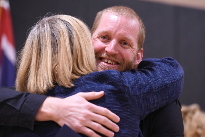 Munger Mountain Elementary School | Jackson, WY | Jan 04, 2019Veteran Milken Educator Kathleen Milburn (WY '96) welcomes Chris Bessonette to the family with an enthusiastic embrace. Chris is the 44th Milken Educator in Wyoming.