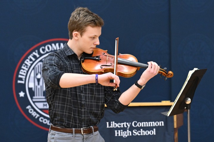 Liberty Common High School | Fort Collins, CO | Mar 07, 2025Violinist Kurt Hoyer, Liberty Common High School senior, performs for the assembly.